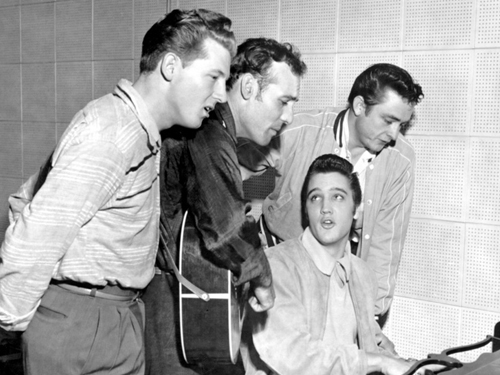 Left to right: Jerry Lee Lewis, Carl Perkins, Johnny Cash and Elvis at the piano.