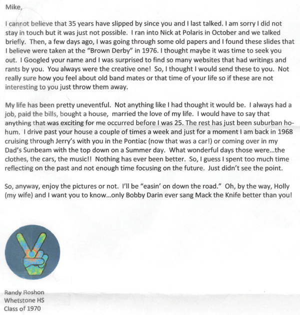 I can't thank Randy enough for taking the time to send the letter and the slides. This was a great time in my life and seeing the pictures brought back wonderful memories!