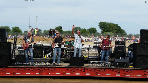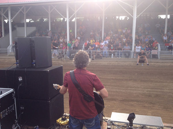In the summer, we do a lot of fairs and festivals, but the Hartford Fair in northern Ohio was a unique experience. We were the grandstand entertainment, but we couldn't set up until the horseshow was over. Then, with the timing and rhythm of a well rehearsed dance group, the crew working the grandstand brought up two flatbeds - one of which already had our PA system on it - and parked them one in front of the other, creating a nice sized stage. We were up and running in no time.