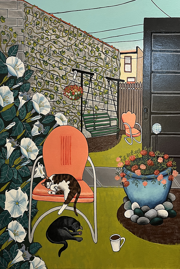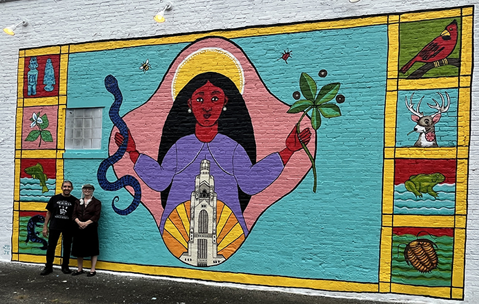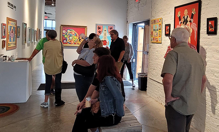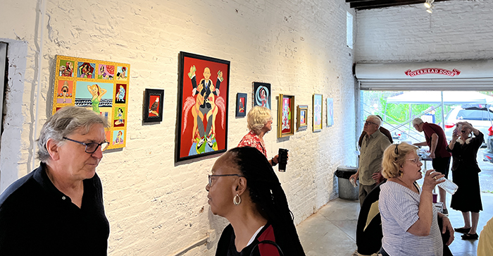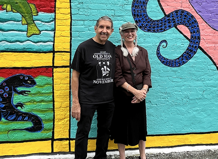 But this segment focuses on Lynda. Her paintings are unique, colorful and sometimes a bit controversial. This past year, Lonna and I attended her first gallery showing and it was a huge success. She was asked to do the mural on the wall of the building as part of the showing.