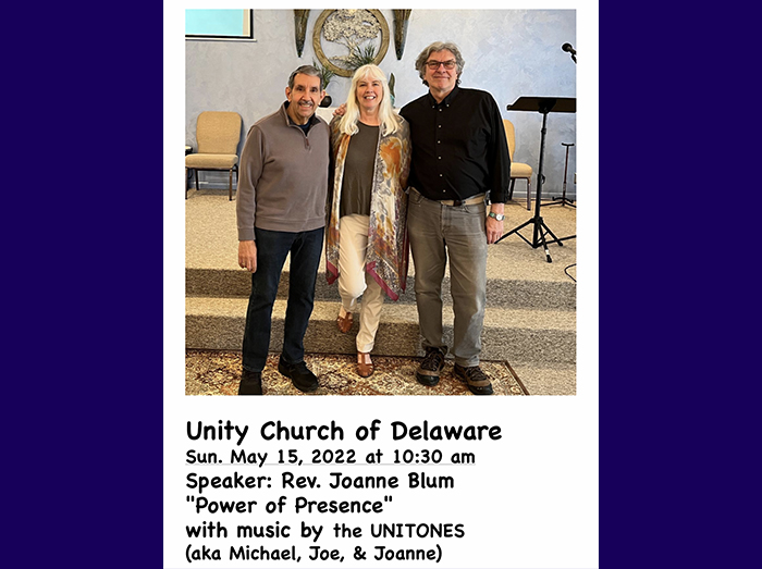On occasion, Joe, Joanne and I perform together as "The Unitones." The song selections are well known spiritual songs by Karen Drucker and others, and usually just a run-through that morning is all the rehearsal we need. Both Joe and Joanne are seasoned performers.