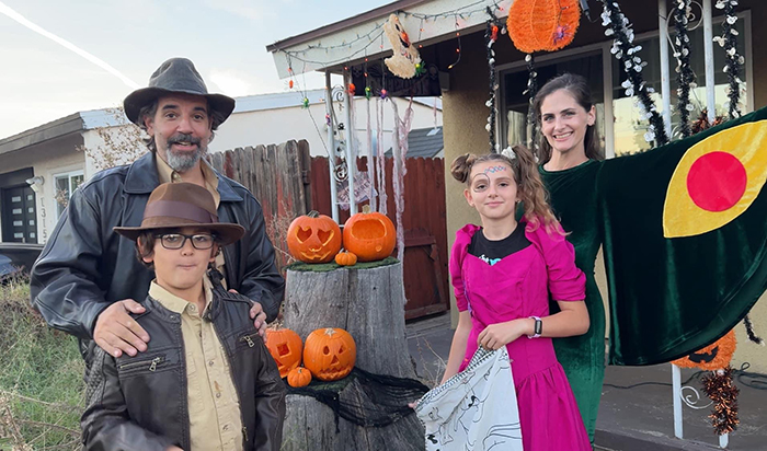Directly across the street, we have Mabel, along with her mom and dad, Laura and Dennis, who are both teachers.