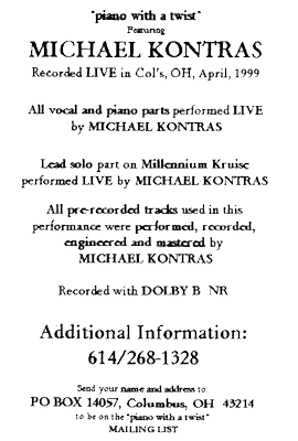 Completing the cover and liner notes made the days and nights literally run together as the year drew to an end. My son, Adam, came up with a perfect graphic design for the cover. It says exactly what I want it to say - this is not traditional piano music. I used the graphic in different forms in a couple other areas of the CD. The text was scrutinized heavily by me, my wife and my cousin, who is a marketing expert. Once I knew that everything was done, I quickly shipped the project to the manufacturer and readied myself for 2001... |