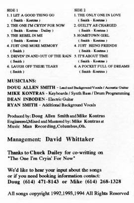 The end of 1995 brought an end to "Smith 'N' Kontras". My partner decided he wanted to go solo, doing gigs on his own. I had grown a lot as an entertainer and writer during my time in "Smith 'N' Kontras" and now was the time for me to put my own show together. I promised myself that I was starting over for the last time. |